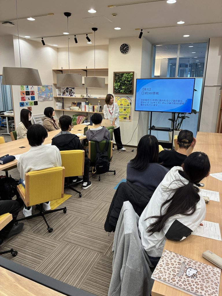 環境問題について学び、エコバッグを1人でも多くの人が少しでも長く使うだけで変わるだけで環境問題に大きく貢献する事が出来る事を教えて頂きました♪